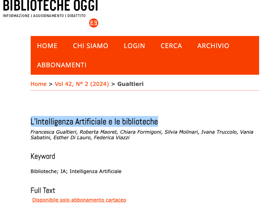 Ancora, l'IA rappresenta un'opportunità e una sfida per il GIDIF-RBM cui pensiamo di far fronte con un percorso che inizierà con l'evento a Bibliostar, marzo 2024, un corso sugli strumenti dell'IA in autunno, una survey per sondare la conoscenza degli strumenti, il monitoraggio della letteratura etc...